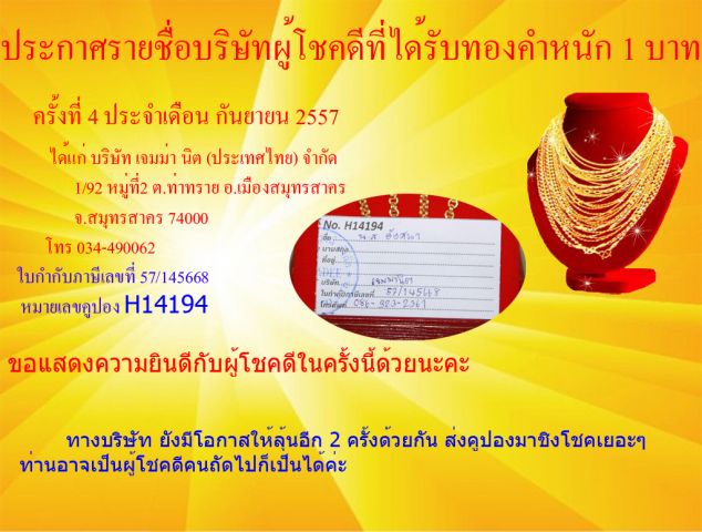 แจกทองคำ ครั้งที่ 5 ประจำเดือน ตุลาคม 2557